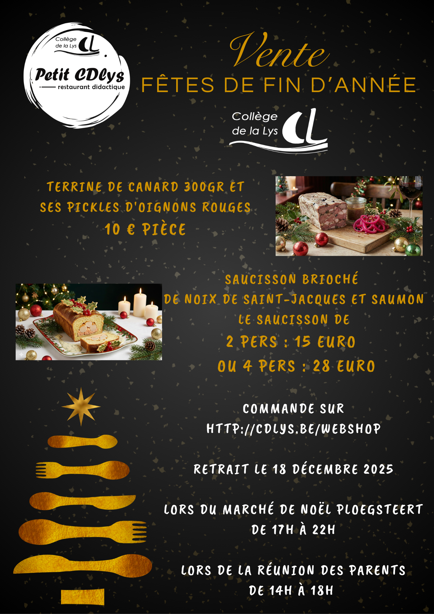 Retrait le 18 décembre 2025 soit lors du marché de Noël de Ploesgteert de 17h à 22h soit lors de la réunion de parents de 14hà 18h.